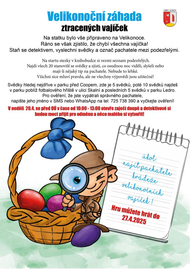 V neděli 20.4. se před OÚ v čase od 10:00 - 13:00 otevře zaječí doupě a detektivové si budou moct přijít pro odměnu a něco malého si vytvořit!